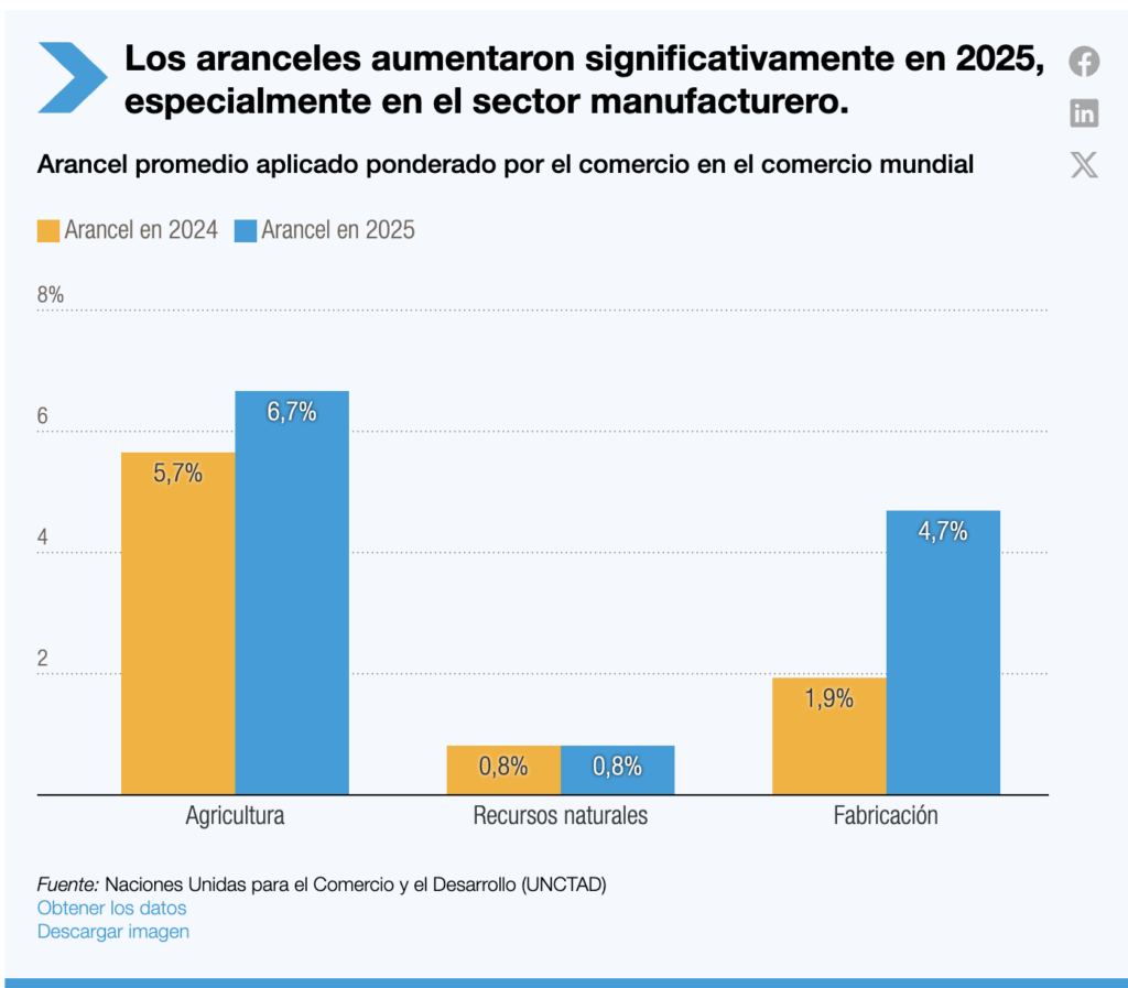 Los aranceles globales aumentaron en 2025, impulsados ​​principalmente por las medidas implementadas por EE. UU., siendo el sector manufacturero el más afectado. Se espera que los gobiernos sigan utilizando aranceles en 2026 para alcanzar objetivos industriales y estratégicos.