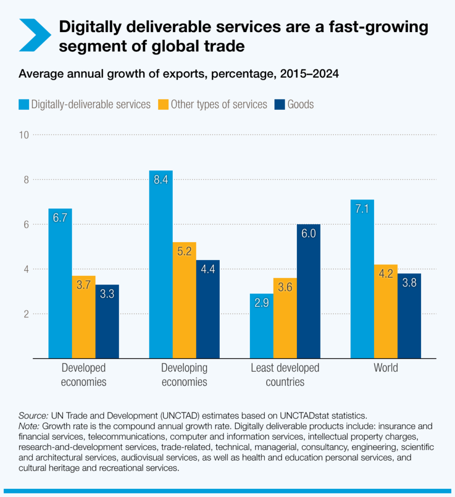 Los servicios digitales impulsan gran parte de este crecimiento, pero siguen siendo limitados en los países menos adelantados. Cerrar la brecha digital es esencial para una mayor participación en el comercio de servicios.