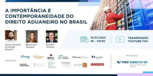 La Dra. @Mariel Orsi Gameiro coordinadora conjuntamente con el Profesor Carlos Eduardo Navarro invitan al evento de apertura del Grupo de Trabajo de Derecho Aduanero del Siglo 21, de la Fundación Getulio Vargas, en el Centro de Estudios Fiscales – NEF / FGV Direito São Paulo. Será el 31 de enero de 2022, a las 9h, de forma gratuita, con la conferencia del profesor Rosaldo Trevisan.