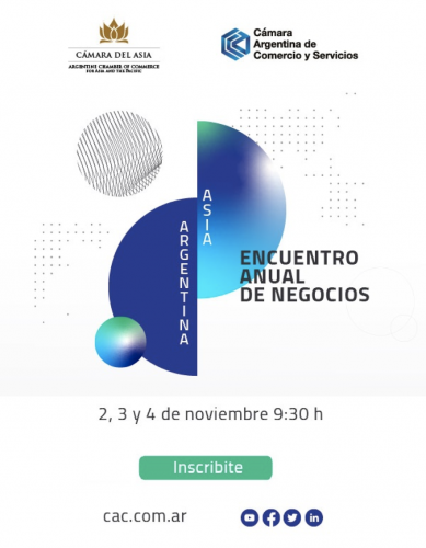 La Cámara Argentina de Comercio y Servicios (CAC), con el acompañamiento de la Cámara de Comercio Argentina para el Asia y el Pacífico como socio estratégico, realizarán los días martes 2, miércoles 3 y jueves 4 de noviembre desde las 9.30 h las jornadas “Encuentro anual de negocios”. La actividad contará con las exposiciones de autoridades de la CAC, embajadores, agregados comerciales, funcionarios y representantes de empresas argentinas que operan en Asia.