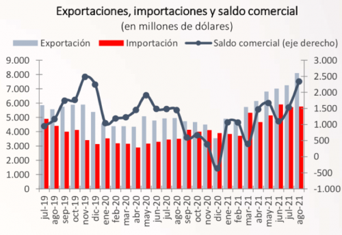 Por el lado de las importaciones, se observó que en agosto sumaron USD 5.754 millones, implicando un aumento de 0,7% en relación a julio. En términos interanuales, crecieron un 64%, debido a aumentos de las cantidades adquiridas (33,4%) y en los precios (22,8%). En relación a estas, Bienes intermedios se posicionó como el rubro con mayor incidencia, con un 40,5%, seguido por Piezas y accesorios para bienes de capital, con un 18,2%.
