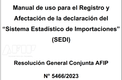 Resolución General 5468/2023 RESOG-2023-5468-E-AFIP-AFIP – Impuesto para una Argentina Inclusiva y Solidaria (PAIS). Decreto N° 72/23. Suscripción de bonos o títulos emitidos en Dólares ...Manual de uso para el Registro y Afectación de la declaración del “Sistema Estadístico de Importaciones” (SEDI) – Resolución General Conjunta AFIP N° 5466/2023.