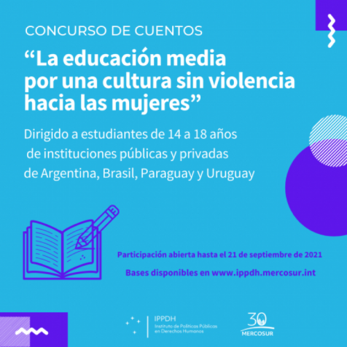 El Instituto de Políticas Públicas en Derechos Humanos del MERCOSUR (IPPDH) convoca a jóvenes estudiantes de instituciones de Argentina, Brasil, Paraguay y Uruguay a participar de un concurso de cuentos cortos sobre los derechos de las mujeres titulado “La educación media por una cultura sin violencia hacia las mujeres”.