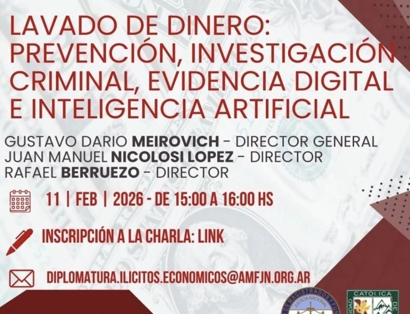 El día miércoles 11 de febrero a las 15hs, llevaremos adelante la charla informativa de la Diplomatura “Lavado de Dinero: prevención, investigación criminal, evidencia digital e inteligencia artificial”, que se dictará por cuarto año consecutivo en la sede de AMFJN y de manera remota a través de Zoom.