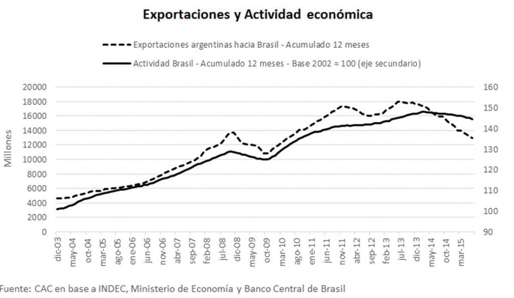 La Cámara Argentina de Comercio (CAC) realizó un análisis de los datos oficiales, del cual se desprende que en los primeros ocho meses de 2015 el comercio bilateral con Brasil se contrajo 16,3% en relación a igual período del año pasado, para totalizar 16.526 millones de dólares.