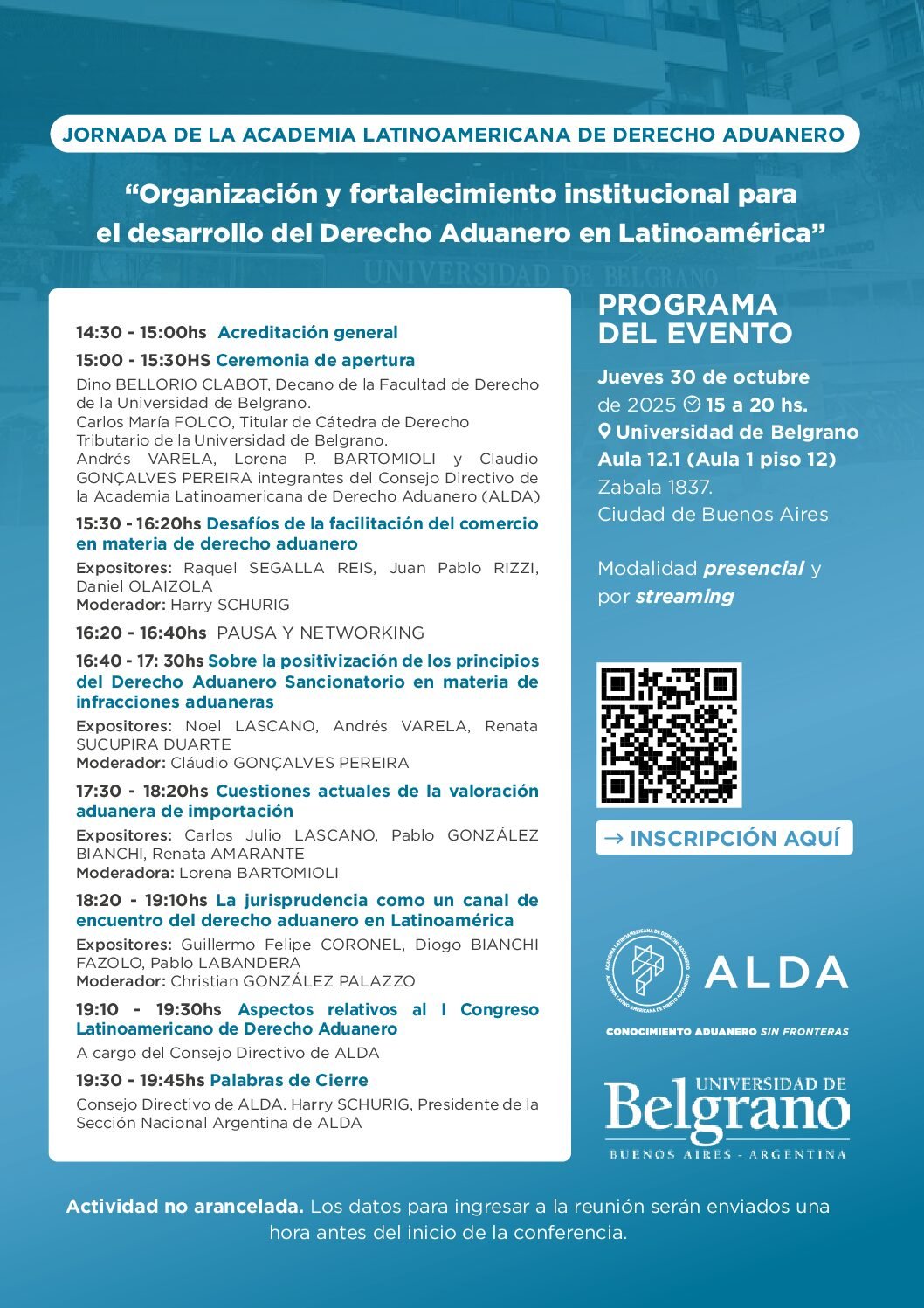Jornada de la Academia Latinoamericana de Derecho Aduanero “Organización y fortalecimiento institucional para el desarrollo del Derecho Aduanero en Latinoamérica” – 30/10, 15 a 20 hs.