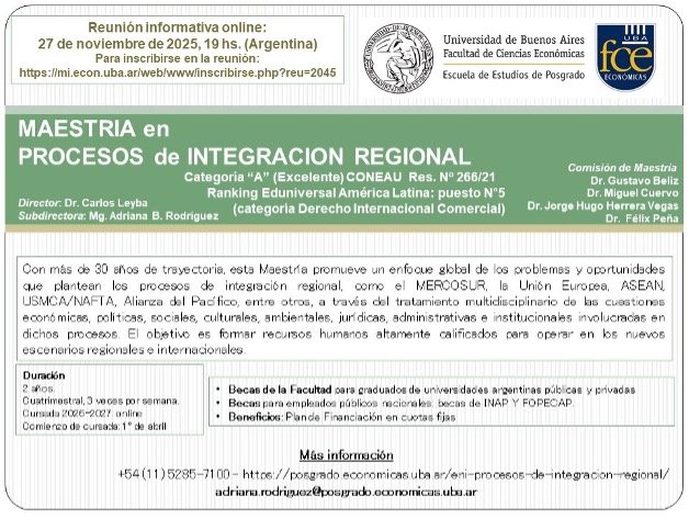 Maestría en Procesos de Integración Regional – Facultad de Ciencias Económicas (UBA) – 27/11, 19 hs.