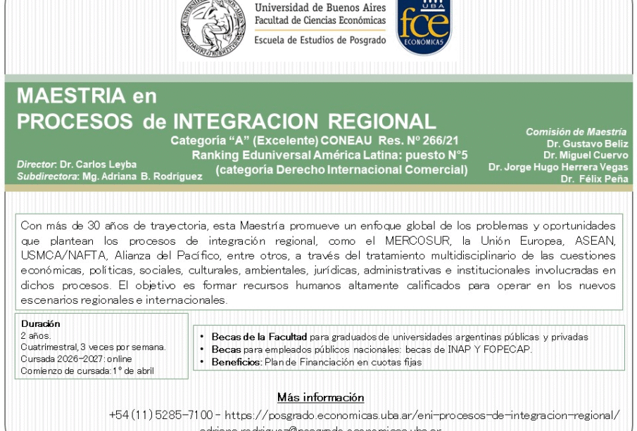 Más información +54(11)5285-7100- y https://posgrado.economicas.uba.ar/eni-procesos-de-integracion-regional/