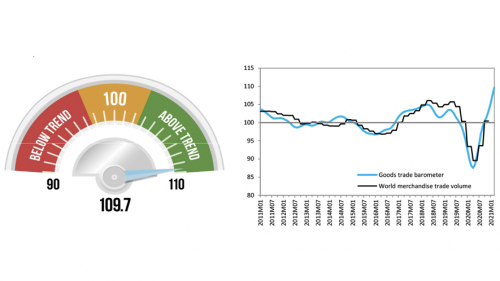 The Goods Barometer is a composite leading indicator for world trade, providing real-time information on the trajectory of merchandise trade relative to recent trends. The barometer’s current reading of 109.7 is nearly 10 points above the baseline value of 100 for the index and up 21.6 points year-on-year, reflecting both the strength of the current recovery and the depth of the COVID-19 shock last year.