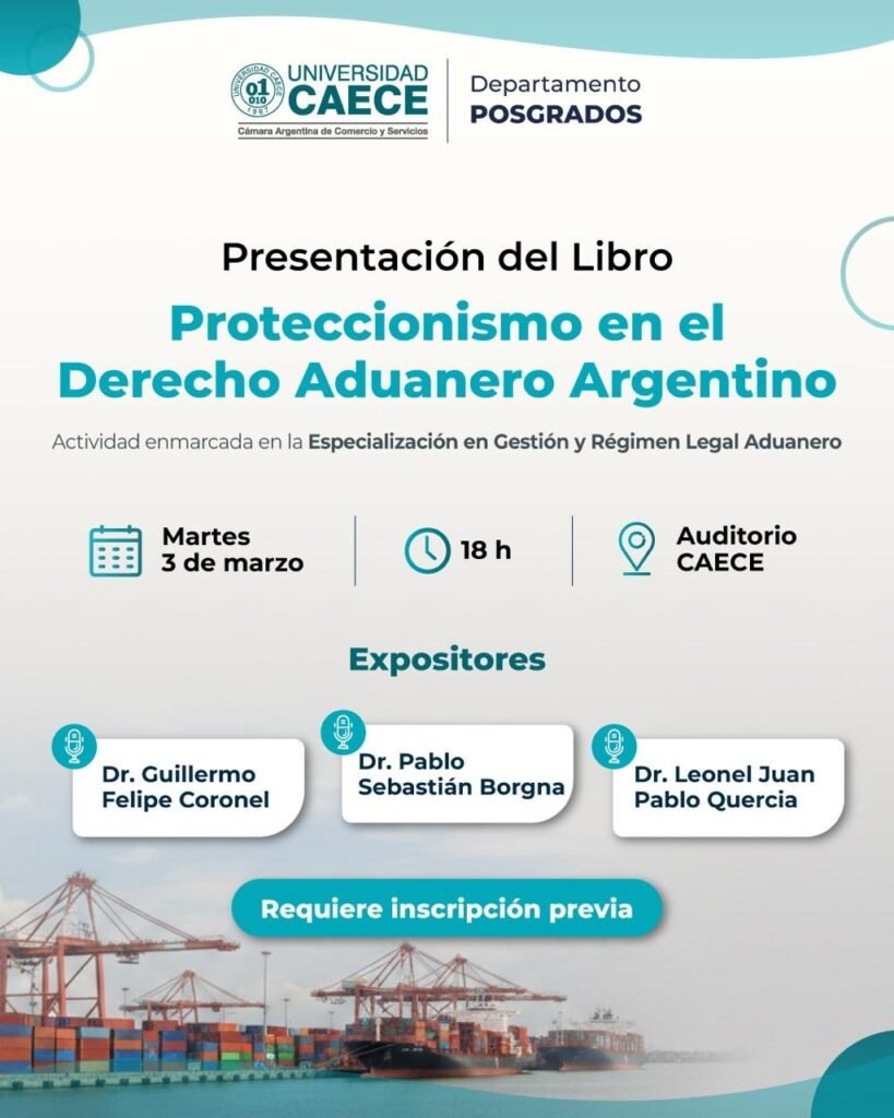 El Departamento de Posgrados de la Universidad CAECE invita a la Presentación del libro “Proteccionismo en el Derecho Aduanero Argentino”, actividad que se lleva a cabo en el marco  de la Especialización de Gestión y Régimen Legal Aduanero a llevarse a cabo el día 3 de Marzo de 2026 a las 18 horas en el Auditorio CAECE.