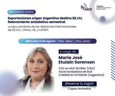 JUEVES 7 DE AGOSTO 2025 PRIMERA JORNADA – Apertura del evento académico por Alejandro E. Messineo (Presidente AAEF), Miguel N. ...Seminario “Exportaciones origen Argentina destino EE.UU. – Relevamiento estadístico semestral” – María José Etulain Sorensen 13/8