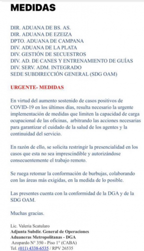 Urgentes medidas en algunas dependencias aduaneras argentinas por COVID-19