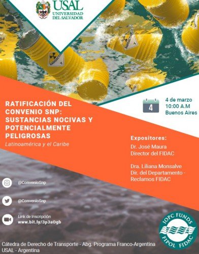 La Universidad del Salvador USAL (Argentina), por intermedio de la Cátedra de Derecho del Transporte – programa Franco-Argentina, organiza el Seminario Internacional sobre la “Conveniencia de la Ratificación del Convenio Internacional sobre Responsabilidad e Indemnización de Daños en Relación con el Transporte Marítimo de Sustancias Nocivas y Potencialmente Peligrosas (SNP) para los Países de Latinoamérica y el Caribe”, a realizarse el próximo jueves 4 de Marzo.