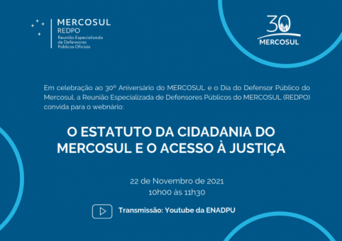 Por motivo de la celebración del Día del Defensor Público y del 30º Aniversario del MERCOSUR, la Reunión Especializada de Defensores Públicos del MERCOSUR (REDPO) realiza el Webinar: El Estatuto de la Ciudadanía del MERCOSUR y el Acceso a la Justicia.